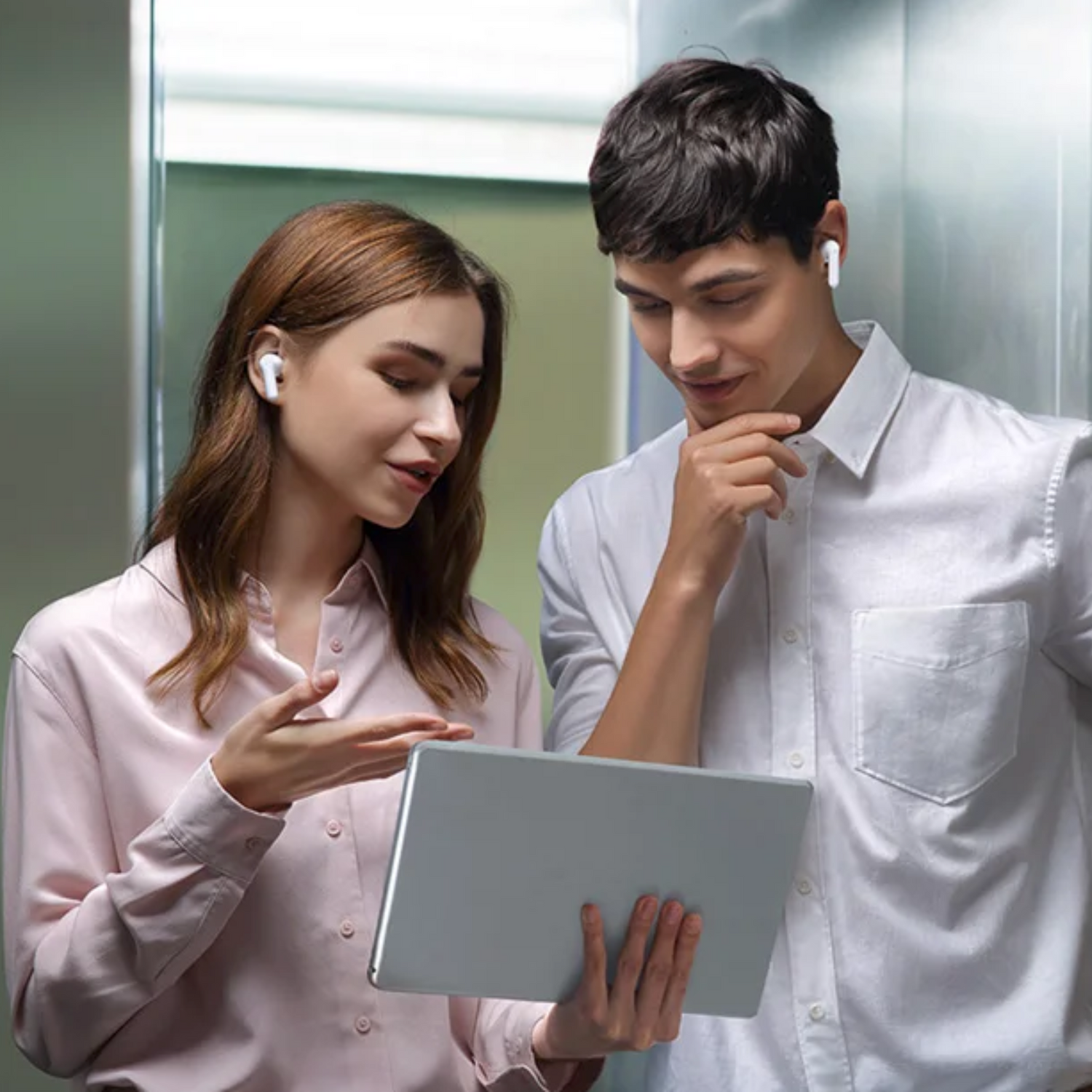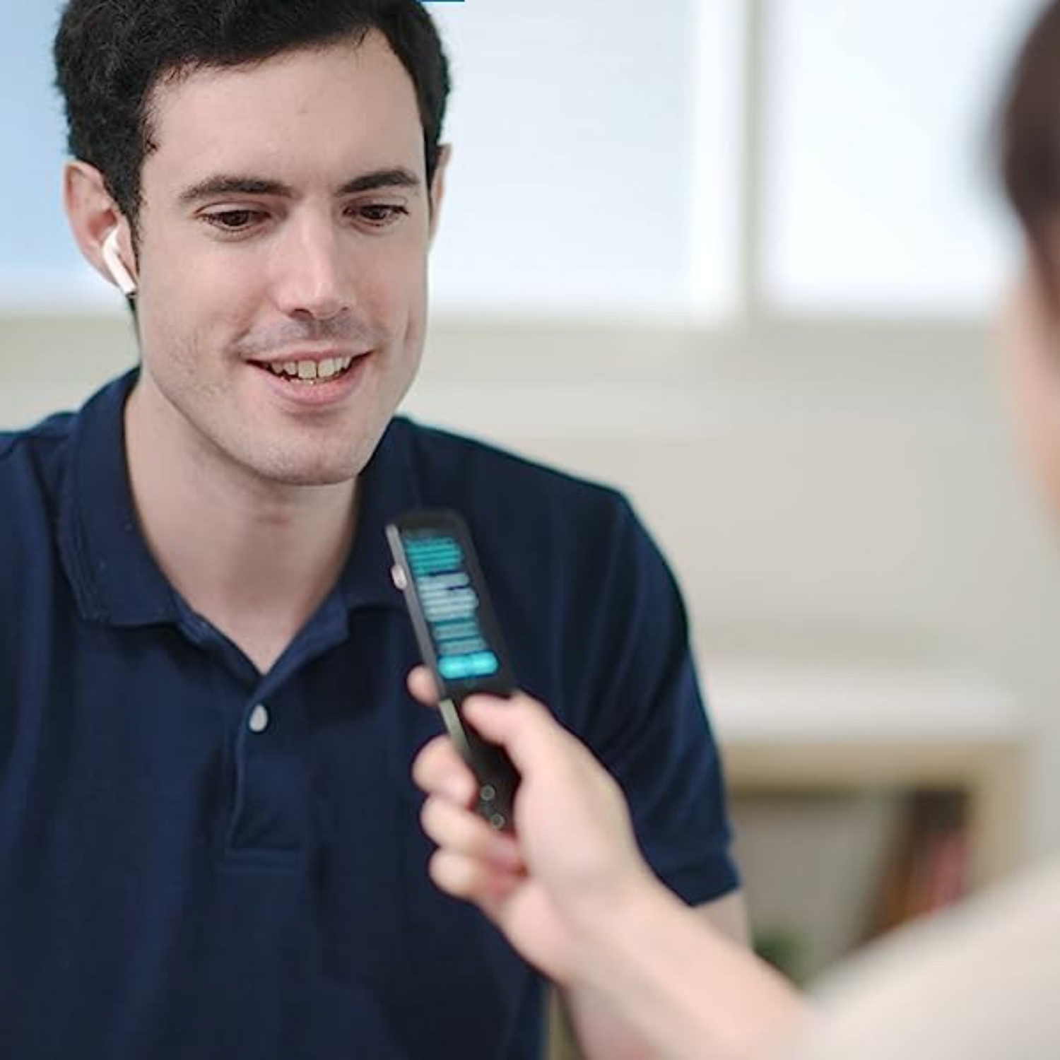 Hear the translation of what the other person is saying directly in your ear, and the same for your companion. Each of you wears one earbud.